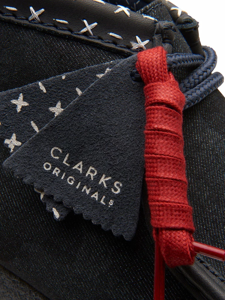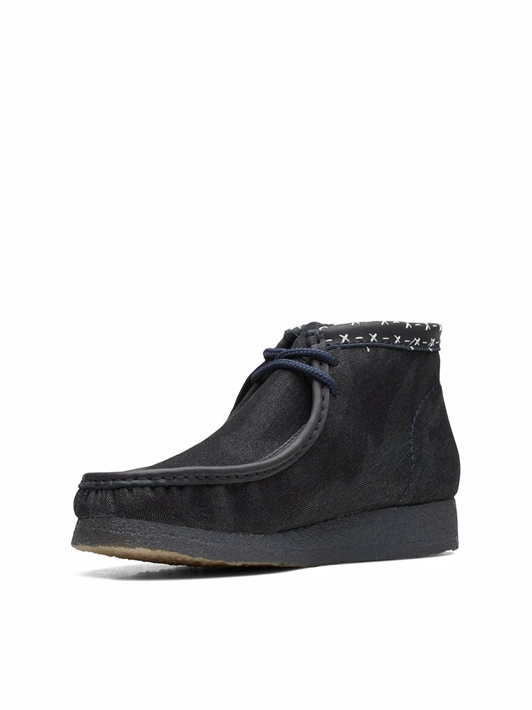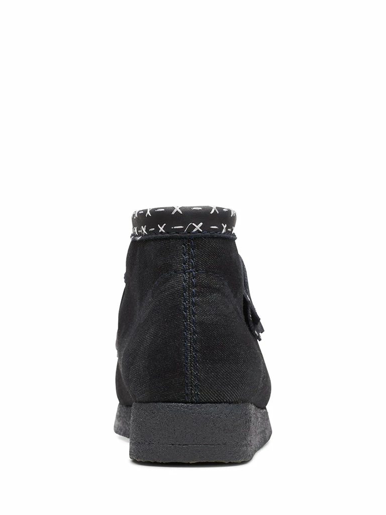 A flexible, lightweight crepe sole comfortably grounds a timeless Wallabee boot reimagined in denim and leather with contrasting topstitching.